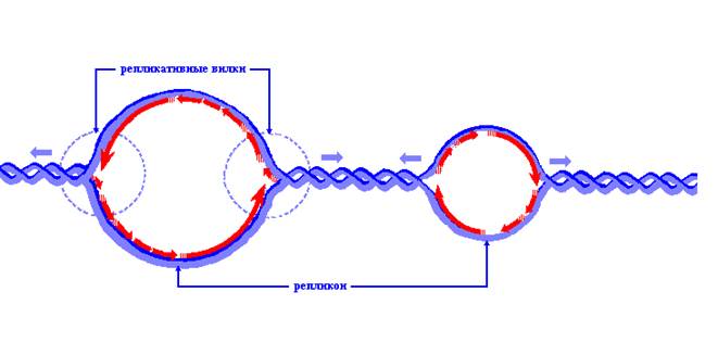 Рис.4. Репликация ДНК эукариотической хромосомы. Показан один из многих репликонов. Репликативные вилки движутся в противоположных направлениях от точки начала репликации.
