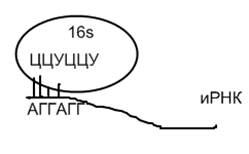 Схема фиксации лидерной последовательности И-РНК на комплементарной последовательности 16S РНК рибосомы