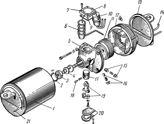 11 – ротор; 12 – статор; 13 – крышка; 14 – всасывающая трубка; 15 – редукционный клапан; 16 – масляный насос; 17 – поршень; 18 – палец с клином; 19 – шатун;