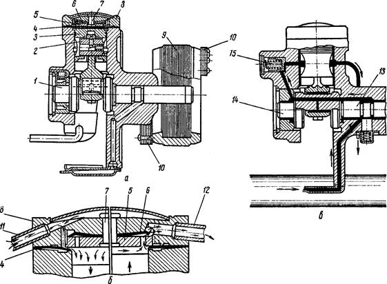 К крышке цилиндра 8 (рисунок 2, б) припаяны две всасывающие трубки 11. Квадратная пластинка всасывающего клапана 4 зажата по контуру между крышкой и цилиндром. Всасывающие отверстия расположены по окружности расточки в крышке. Круглая пластина нагнетательного клапана 6 закрывает отверстия в седле 5. Седло соединено заклепкой 7 с крышкой цилиндра 8. В пространство над седлом введена нагнетательная трубка 12.