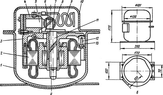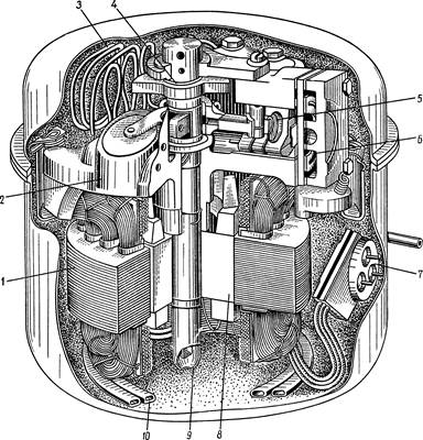 В компрессорах АЕ (рисунок 6) более поздней конструкции вместо эксцентрикового вала применены коленчатый вал и шатун с разъемной нижней головкой. Двигатель со статором 1 и ротором 8 расположен снизу, поэтому изменен масляный насос: на конец вала 4 надета трубка 9, разделенная перегородкой на две неравные части. Пар из цилиндра 5 и полости 6 идет через глушители (камерный 2 и трубчатый 3). Проходные контакты 7 расположены в нижней части кожуха.