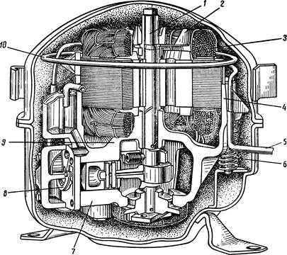 Компрессоры фирмы «Текумсе» (США) – самой крупной в мире – позволяют проследить развитие конструкций герметичных компрессоров за рубежом. Первоначально для бытовых холодильников и торгового холодильного оборудования изготовляли одноцилиндровые компрессоры типа S с эксцентриковым валом (рисунок 5). Чугунный корпус 4, 9 с горизонтальным цилиндром 7 и верхним подшипником установлен на пружинных виброизоляторах 6. В верхней части корпуса запрессован статор 3 встроенного электродвигателя. На роторе для более интенсивного охлаждения двигателя имеется крыльчатка 2. Всасывающий клапан упругий консольный нагнетательный клапан 8 подковообразный. Сжатый пар проходит через нагнетательный глушитель и трубку 10 в патрубок 5. В качестве масляного насоса, как и в последующих моделях, служит вал компрессора 1.