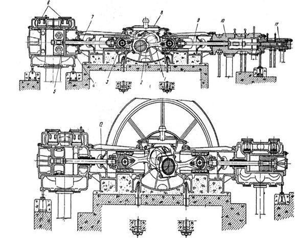 1 – шатун; 2 – картер; 3 – направляющая крейцкопфа; 4 – крышка цилиндра; 5 – поршни; 6 – клапаны; 7 – сальники; 8 – крышка картера; 9 – шток; 10, 11 цилиндры; 12 – маслосниматель.