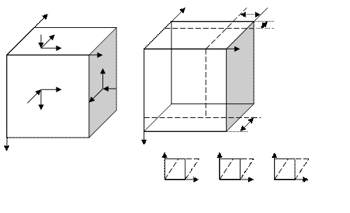 При решении конкретных задач механики грунтов необходимо определять напряжения в сплошной среде. При схематизации реальных грунтов в виде модели сплошной среды в трехмерном пространстве напряжения и деформации в точке сплошной среды описываются шестью независимыми компонентами (составляющими). В декартовой системе координат Оx,y,z напряженное состояние грунта в точке характеризуется нормальными напряжениями Ϭx, Ϭy, Ϭz и касательными напряжениями τxy, τyz, τzx, а деформированное состояние относительными осевыми деформациями εz, εx, εy и относительными сдвиговыми деформациями γxy, γyz, γzx (рис. а, б)
