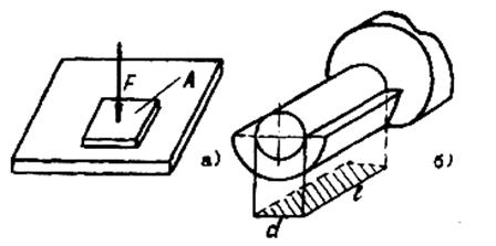 Если два тела подвергаются сжимающей нагрузке и соприкасаются между собой, то общие поверхности соприкосновения называют поверхностями контакта. На поверхностях контакта возникают напряжения смятия. При расчете на смятие допускают, что силы взаимодействия равномерно распределены по поверхности соприкосновения и в каждой точке нормальны к пой поверхности, т.е. возникают нормальные напряжения. Элементарная сила на элементарной площадке