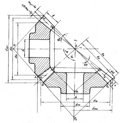 где mtc - внешний окружной модуль, являющийся стандартным. Конусы ОЕЕ1, и ОЕ1Е2 - называются основными или начальными конусами. При вращении зубчатых колес эти конусы перекатываются друг по другу без скольжения аналогично начальным окружностям цилиндрических зубчатых колес.