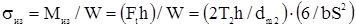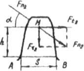 АВ - опасное сечение, оно будет под точкой М в середине зуба. Центр тяжести у трапеции не в середине, а на расстоянии 0,4 b oт большего основания, т.к. мы рассчитываем несколько ослабленное сечение (т.е. середину зуба), то компенсируем это тем, что уменьшены на 15% [σ]F, т.е. примем 0,85 [σ]F, и в дальнейшем считаем опасное сечение прямоугольным с шириной S и длиной b. Аналогично цилиндрическим колесам, зубья конического колеса рассчитываются по результирующему напряжению ору основания зуба, равному разности изгибающих и сжимающих напряжений: