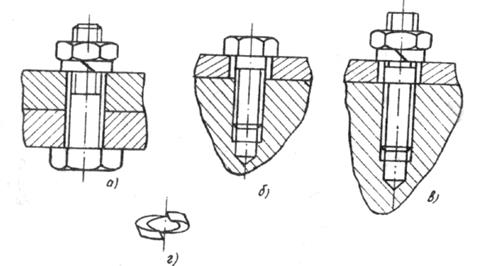 а) Болтовые соединения - наиболее простые и дешевые. Применяются для скрепления деталей небольшой толщины в паре с гайкой.