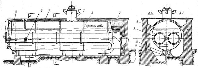 1 – відбортовка переднього днища; 2 – колосникова решітка; 3 – цегляний поріг топки; 4 – корпус котла; 5 – сухопарник; 6 – кільця між відбортовками звєньєв жарової труби; 7 – відбортовка заднього днища; 8 – обмуровка котла; 9 – жарова труба; 10 – опора котла; 11 – повздовжня перегородка, яка розділяє газоходи.