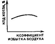 Надмірне зменшення коефіцієнту надлишку повітря призводить до появи хімічної неповноти спалювання. Втрати теплоти при цьому буде тим більші, чим менше коефіцієнт надлишку повітря. ККД котла найбільше значення при визначеному коефіцієнті надлишку повітря (рисунок 6.3).