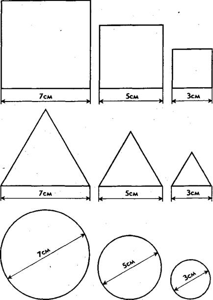 Как видно из приведенных выше списков, в предложенные искусственные понятия входят от одного до трех различных признаков. Фигуры соответствующего размера, формы и цвета (всего 27 фигур с разными признаками) вырезаются из цветной бумаги и наклеиваются на квадратные картонные карточки размером 8x8 см.