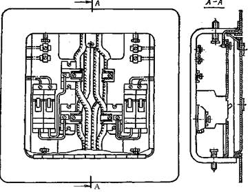 На рис. 15. показан этажный щиток для присоединения четырех квартирных щитков. На шасси рамы справа и слева установлены четыре автоматических выключателя, от-ветвительные зажимы для присоединения автоматических выключателей к проводам магистрали (стояка) и зажимы для присоединения нулевых проводов вводов в квартиры к
