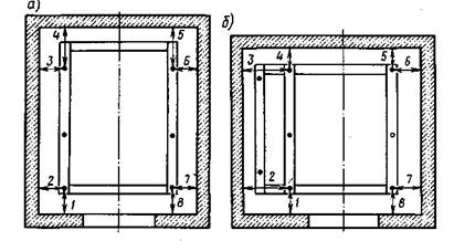 | Рис. 29. Установка настилов в шахте при одинаковом (а) и разном (б) расположении направляющих |