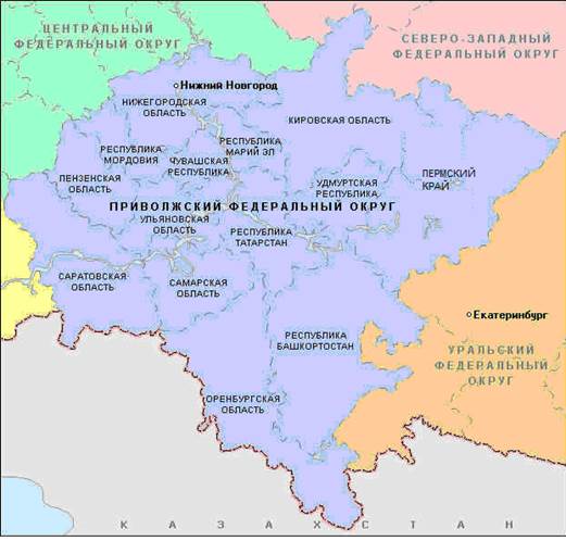 Республики – Башкортостан, Марий Эл, Мордовия, Татарстан, Удмуртия, Чувашская. Пермский край. Кировская, Нижегородская, Оренбургская, Пензенская, Самарская, Саратовская, Ульяновская области.