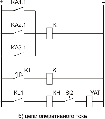 Промежуточное реле устанавливается в тех случаях, когда реле времени не может замыкать цепь катушки отключения YAT из-за недостаточной мощности своих контактов. Блок-контакт выключателя SQ служит для разрыва тока, протекающего по катушке отключения, так как контакты промежуточных реле не рассчитываются на размыкание.