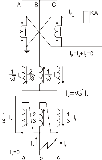 Схема применяется в распределительных сетях 6...10 кВ и для защиты электродвигателей.