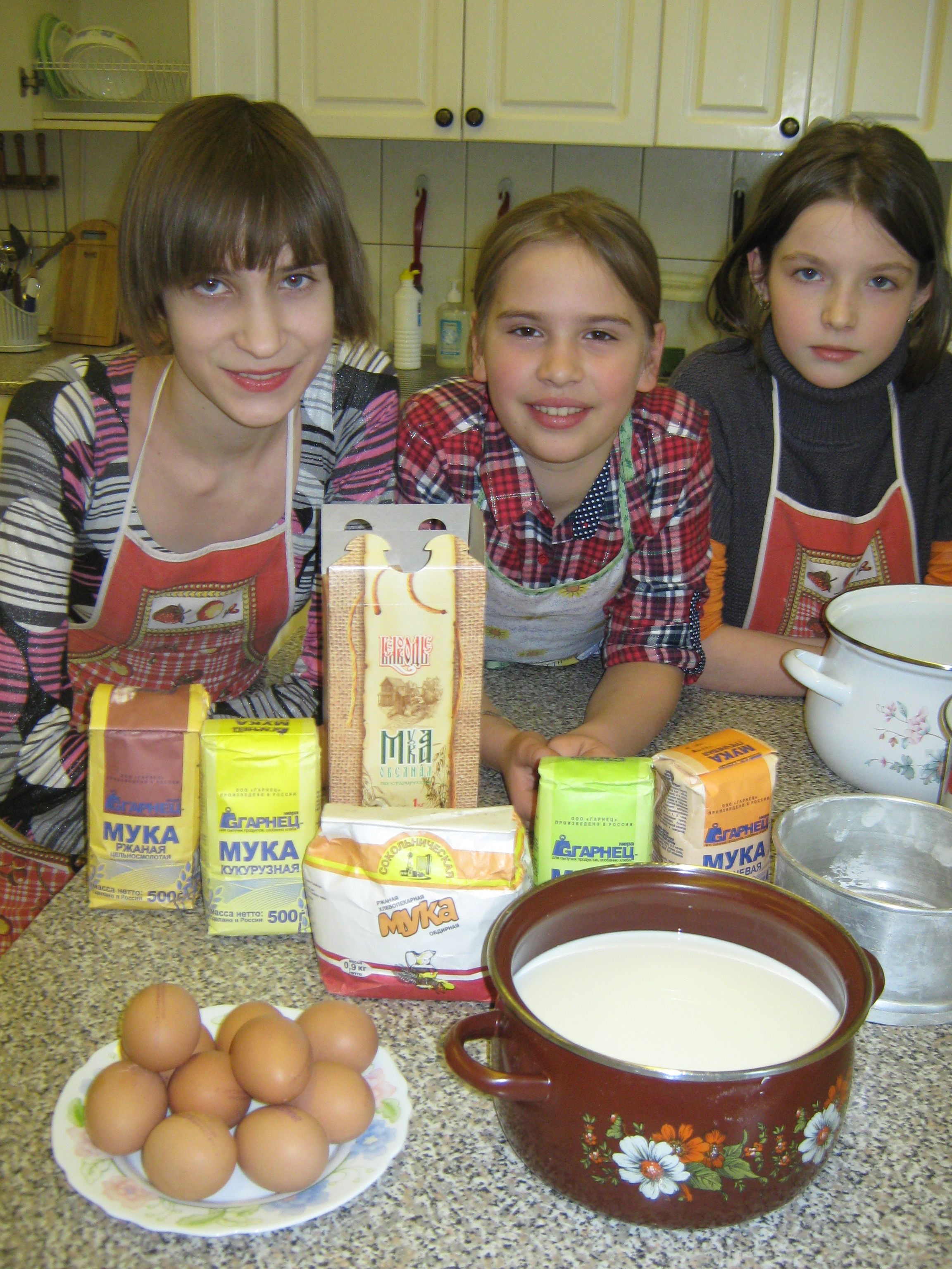 Тогда мы подумали: «А не приготовить ли нам любимые блины, тем более что на втором году обучения по программе «Берегиня»(русская кухня и современная культура питания) мы с Еленой Евгеньевной готовили блины из овсяной и гречневой муки». Во всех изученных нами информационных источниках нет никакого упоминания о том, что в меню космонавтов есть блины, видимо, они считаются питательным, но не очень полезным блюдом. Значит, их надо сделать из полезной для здоровья муки, не рафинированной пшеничной, а овсяной и гречневой, содержащей оболочку зерна с большим количеством витаминов и минералов.