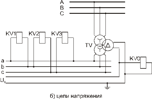 Для надежной работы блокировки при 2 – фазных КЗ устанавливаются 3 реле напряжения KV, подключаемые на линейные напряжения. В этом случае при двухфазном КЗ, например ВС, напряжение UВС будет равным нулю и реле KV2 замкнет свои контакты, разрешая защите действовать на отключение. Однако при такой схеме включения реле плохо реагируют на однофазные КЗ. Поэтому в сетях с заземленной нейтралью предусматривается дополнительное реле KV0, реагирующие на напряжение нулевой последовательности, появляющиеся при замыканиях на землю. В сети с изолированной нейтралью реле KV0 не устанавливается, так как защита должна действовать только при междуфазных КЗ.