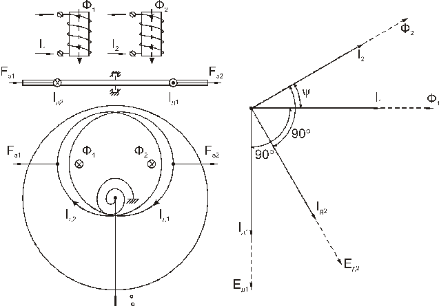 Реле состоит из подвижной системы, расположенной в поле двух магнитных потоков Ф1 и Ф2(рис. 4.4.2). Магнитные потоки создаются токами, проходящими по обмоткам неподвижных электромагнитов. Подвижная система представляет собой алюминиевый диск, закрепленный на оси. Пронизывая диск, магнитные потоки наводят в нем ЭДС Ед1 и Ед2. Под действием этих ЭДС в диске возникают вихревые токи Iд1 и Iд2, замыкающиеся вокруг оси индуктирующего их магнитного потока. Между магнитным потоком и током, находящимся в его поле возникает электромагнитная сила взаимодействия: Fэ1 – от взаимодействия магнитного потока Ф1 с током Iд2 и Fэ2 – от взаимодействия магнитного потока Ф2 с током Iд1. (Сила взаимодействия между магнитным потоком и контуром тока, индуктированного этим потоком, равна нулю.) Результирующая сила Fэ=Fэ1+FЭ2 создает вращающий момент МЭ=Fэd, где d – плечо силы Fэ. Диск приходит во вращение: