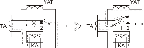 Реле типов РТ–85, 86, 95 имеют контакты специальной усиленной конструкции, предназначенные для выполнения защиты на оперативном переменном токе (см. рис. 4.4.6). Работа контактной системы заключается в следующем: вначале замыкаются контакты 1, а потом размыкаются контакты 2, таким образом катушка отключения выключателя подключается без разрыва цепи трансформатора тока.