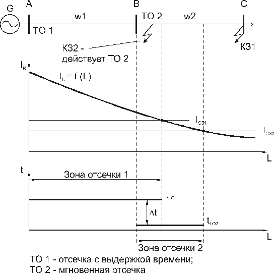 Мгновенная отсечка защищает только часть линии, чтобы выполнить защиту всей линии с минимальным временем действия применяется отсечка с выдержкой времени: