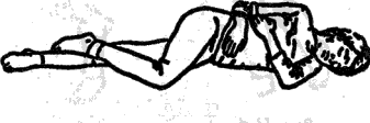 Если вам неудобно лежать, вытянув руку (рис. 11), может быть удобнее положить ее сзади, уперев ладонь в пол. Другая согнута в локте и подложена под голову. Лежать надо с полузакрытыми глазами, иначе можно уснуть. Самоконтроль дыхания в позе лежа на боку можно осуществлять так, как показано на рис. 12.