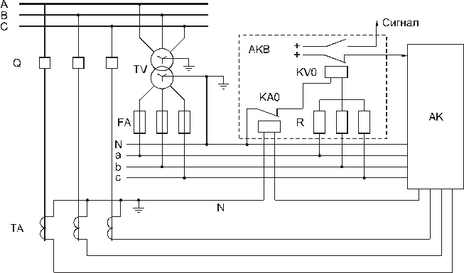 В нормальном режиме напряжение на реле KV0 отсутствует. При обрыве одной или двух фаз возникает U0, под влиянием которого в реле KV0 появляется ток и оно срабатывает, давая сигнал и выводя защиту из работы.