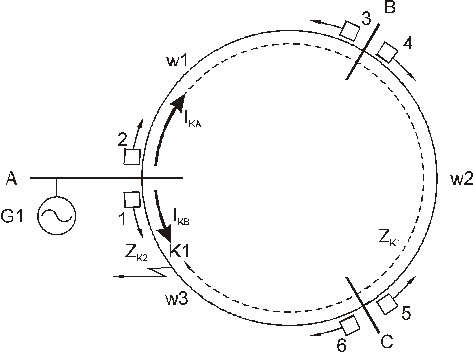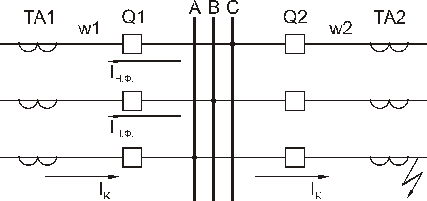 Реле KW, включенные в фазы А и В линии w1, могут разрешить защите отключить неповрежденную линию. Ток срабатывания защиты должен быть отстроен от тока неповрежденной фазы: