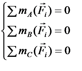 Теорема. Для равновесия произвольной плоскости системы сил необходимо и достаточно, чтобы суммы моментов всех сил системы относительно каждого из трёх произвольных, но не лежащих на одной прямой центров равнялись нулю.