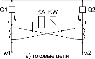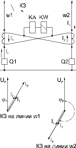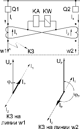 Данная защита применяется на параллельных линиях с самостоятельными выключателями. К защите таких линий предъявляется требование – отключать только поврежденную линию. Схема по сути представляет собой токовую поперечную дифференциальную защиту, дополненную реле направления мощности двустороннего действия или двумя реле направления мощности одностороннего действия.