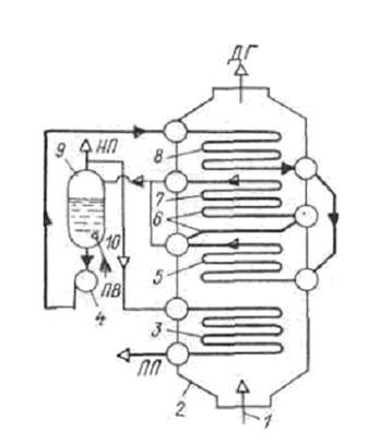 Котельная установка включает собственно котел 2, автономный сепаратор 9, циркуляционный насос 4. Утилизационный котел состоит из экономайзера 8, двух секций парообразующих змеевиков 7 и 5 и пароперегревателя 3. Дымовые газы поступают от главного двигателя (стрелка 1), омывают поверхности нагрева, расположенные в корпусе котла, и уходят в дымовую трубу. Питательная вода поступает в сепаратор 9 (стрелка 10), оттуда забирается циркуляционным насосом 4 и направляется в экономайзер 8. Из экономайзера по перепускной трубе она поступает в нижнюю секцию 5 парообразующего пучка, которая соединена со второй секцией 7 трубой 6. Пароводяная смесь из секции 7 направляется в сепаратор 9. Насыщенный пар из сепаратора используется для бытовых нужд. Значительная часть производимого пара подается в пароперегреватель 3, где перегревается и направляется к ходовому турбогенератору судовой электростанции.