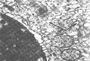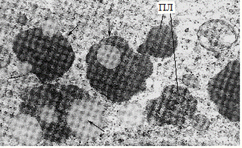 | Рис.43. Микрофотография лизосом в цитоплазме (ПЛ – первичная лизосома; стрелки – аутофагосомы (лизосомы, поглощающие липидные включения). |