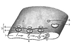 | Рис. 39. Схема строения шероховатого (гранулярного) ретикулума: 1 – полость цистерны; 2 – рибосомы: а – большая субъединица рибосомы; б - малая субъединица рибосомы; 3 – информационная РНК; 4 – синтезируемая молекула белка; 5 – молекула белка в просвете цистерны. |