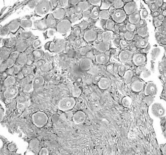 Рассмотрите комплекс Гольджи на микропрепарате «Аппарат Гольджи в нервных клетках спинального ганглия котенка (осмиевая кислота)», зарисуйте (Рис.40; Атлас, фото 25), укажите увеличение, тип окрашивания, укажите стрелкой комплекс Гольджи.