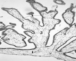 | Рис.122. Строение стенки хориона. 1 – кровеносные сосуды в хориальной пластинке; 2 - ворсинка; 3 - трофобласт. |