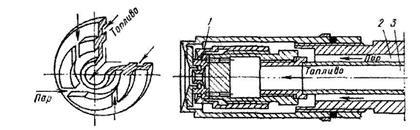 Паромеханическая форсунка по конструкции мало отличается от механической. На рис. 2.8 изображен наконечник паромеханической форсунки. Мазутный канал целиком напоминает механическую форсунку. При большой нагрузке мазут последовательно проходит центральный канал 3, тангенциальные каналы, вихревую камеру и через отверстие (сопло) в распылителе 1 поступает в топку. При малой нагрузке, кроме того, используется пар, который подается в паровой канал 2, проходит тангенциальные каналы и вихревую камеру парового распылителя (на рисунке они показаны отдельно) и далее, встречаясь с мазутом, распыливает его.