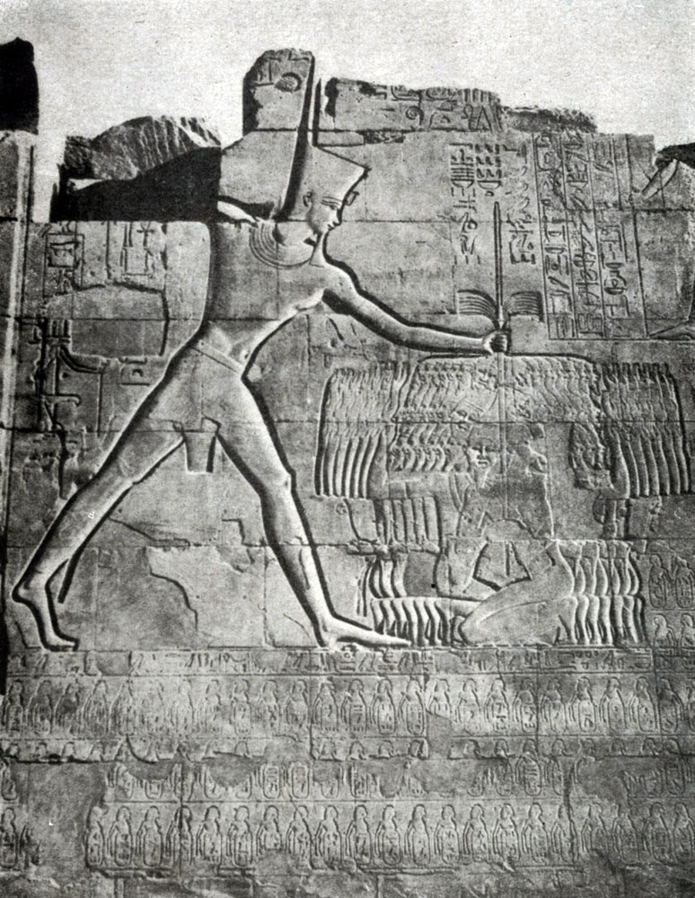 70. Тутмос III, поражающий врагов. Рельеф с пилона Тутмоса III храма Амона в Карнаке. XVIII династия. Вторая четверть 15 в. до н. э.