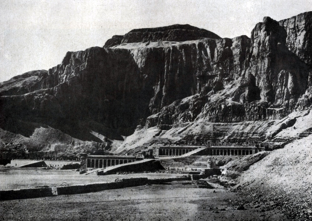 Особое место среди царских заупокойных храмов занимает храм царицы Хатшепсут, знаменитой женщины-фараона (конец 16 в. до н.э.). Она построила свой храм у скал Деир-Эль-Бахри около. Фив, рядом с храмом царей XI династии Ментухотепов, родоначальников фараонов-фиванцев, желая этим подчеркнуть свою принадлежность к их роду и тем самым оправдать правомерность своего столь необычного для женщины обладания престолом. Этими же побуждениями объяснялось и стремление уподобить ее храм храму Ментухотепов. Однако храм Хатшепсут явно превосходил последний как размерами, так и богатством декорировки. Грандиозный по масштабам, украшенный множеством скульптур, храм Хатшепсут являлся гармоничным сочетанием трех возвышавшихся одна над другой террас с высеченными в скалах залами, фасады которых были оформлены колоннадами. Наклонные плоскости пандусов прекрасно связывали чередующиеся линии горизонтальных террас и вертикальных колонн в одно целое и являлись в то же время продолжением линий дороги, которая шла из долины; строгие протодорические колоннады выступали на фоне высоких отвесных скал. В святилище было свыше двухсот статуй. Богатству оформления храма соответствовала и внутренняя отделка — с золотыми и серебряными плитами полов, инкрустированной бронзой дверей и т. д. Строителем этого замечательного храма был Сенмут, один из талантливейших зодчих Египта и человек, близкий к царице.