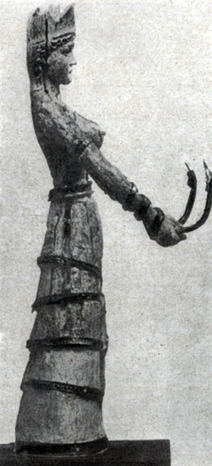 Период расцвета критского искусства сопровождался развитием мелкой пластики. Найденные на Крите статуэтки богинь, держащих в руках змей, сделанные из фаянса или из слоновой кости, фаянсовые таблички с разноцветными фигурами летучих рыб, раковин, козы с козленком и др. сочетают обычную для эгейского искусства декоративность и изысканность с большой долей реалистической наблюдательности. Статуэтки богинь со змеями, с их традиционным критским костюмом и украшенным цветами убором на голове, с их торжественной, неподвижной позой были, вероятно, изображениями почитаемой во всем Средиземноморье богини — покровительницы всего живого, богини растительности; змея, атрибут богини, считалась священным существом. Такой образ богини, отражавший облик знатной критянки, мог сложиться лишь в обществе, достигшем уже значительного социального расслоения.