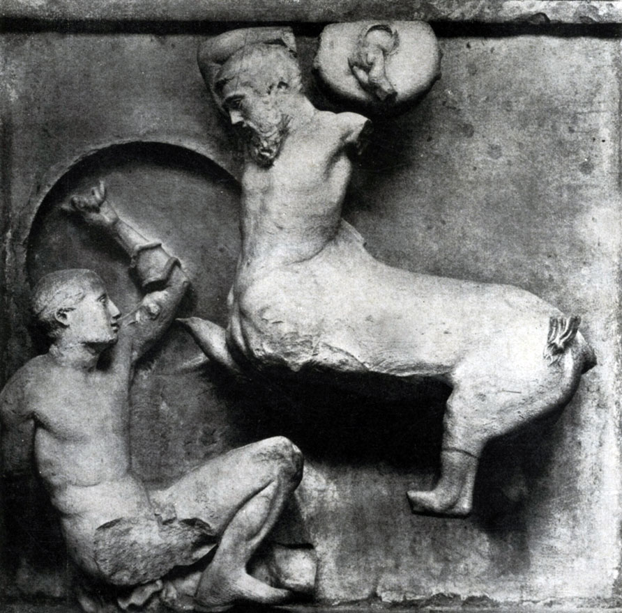 Метопы эти были явно выполнены разными мастерами. В некоторых из них еще есть та резкая угловатость движения и подчеркнутая передача отдельных деталей, которая была, например, в западном фронтоне храма Зевса в Олимпии, посвященном тому же сюжету. В других, притом самых лучших, можно видеть все мастерство высокой классики в естественном и свободном воспроизведении любого реального действия и то глубокое чувство меры, которое неизменно сохраняет гармоническую красоту образа совершенного человека. Движения лапифов и кентавров в этих метопах непринужденно свободны, они обусловлены только характером той борьбы, которую они ведут, — в них не остается никаких отзвуков слишком очевидного и строгого подчинения архитектурной форме, какое было еще в метопах храма Зевса в Олимпии. Так в превосходном рельефе Парфенона, где полуобернувшийся назад лапиф, властной рукой ухватив за волосы кентавра, останавливает его стремительный бег и сгибает его тело, подобно тому как сгибают тугой лук, композиция подчинена логике движения фигур и сцены в целом и вместе с тем естественно соответствует пределам отведенного архитектурой пространства.
