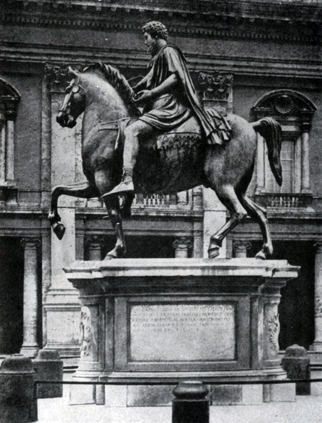 От времени Антонинов до нас дошел бронзовый памятник Марку Аврелию, установленный в 16 в. на Капитолийской площади в Риме. Как единственный образец античного конного памятника, это произведение пользовалось в последующие столетия — вплоть до 19 в. — большой славой. Однако не следует забывать, что характерные для антониновского искусства черты пассивности, созерцательности образа имеются и в этом произведении и находятся в противоречии с героической идеей, воплощать которую призван конный памятник.