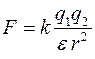 Закон Кулона:сила взаимодействия F между двумя неподвижными точечными зарядами q1 и q2 прямопропорциональна величинам этих зарядов и обратно пропорциональна квадрату расстояния r между ними: