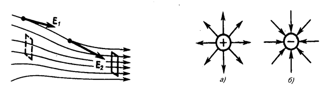 Если поле создается точечным зарядом, то силовые линии – это радиальные прямые, выходящие из положительного заряда (рис. 2, а), и входящие в отрицательный заряд (рис. 2, б).
