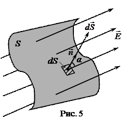 через произвольную поверхность S, необходиморазбить эту поверхность на элементарные площадки dS (рис. 5),определить элементарный поток dФЕ через каждую площадку dS по формуле:
