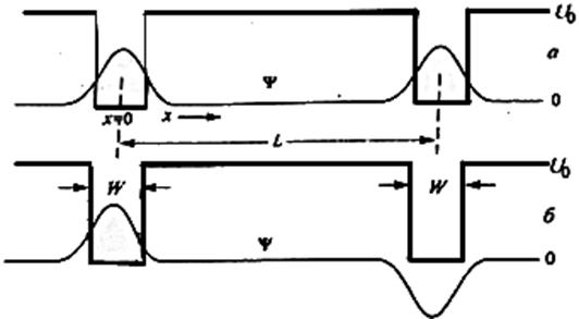 Для выяснения влияния, оказываемого сближением изолированных квантовых ям, рассмотрим систему, состоящую из двух одинаковых одномерных прямоугольных квантовых ям, разделенных проницаемым потенциальным барьером (рис. 1.13).