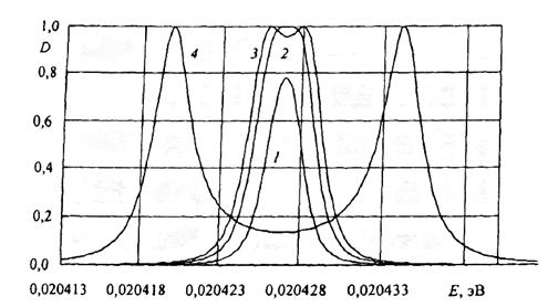 | Рис. 1.21. Зависимости коэффициента прохождения D от энергии для трехбарьерной структуры: 1 - d = 2.5 dk, 2 - d = 2.15 dk, 3 - d = 1.9 dk, 4 - d = 1.5 dk, здесь d - ширина среднего барьера, dk -ширина внешних барьеров |