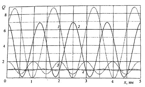 Кривая 2 соответствует энергии частицы Х= 15,5 (первое надбарьерное резонансное состояние). Данная энергия отвечает условию R = 0, т.е. (1.10.12). В области между барьерами также накапливаются частицы (Q > 1), однако значительно меньше, чем в первом случае. Такое поведение объясняется резким увеличением коэффициента прохождения области второго барьера с увеличением энергии частицы при переходе от подбарьерного туннелирования к надбарьерному прохождению. В результате для создания одинаковых потоков частиц, прошедших через область второго барьера при подбарьерном туннелировании и надбарьерном прохождении, в первом случае в области квантовой ямы необходимо накопить больше частиц (т.е. увеличить поток частиц, падающих на второй барьер), чем во втором.