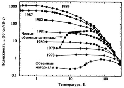 На рис. 6.2 представлены данные, иллюстрирующие прогресс, достигнутый в области повышения подвижности электронов при продольном переносе за последние двенадцать лет в наноструктурах на основе GаАs, типа описываемых выше полевых МОП-транзисторов.