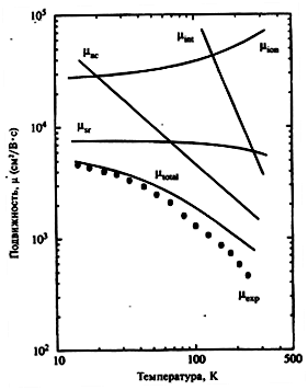 | Рис. 6.3. Температурная зависимость подвижности электронов в кремниевых полевых МОП-транзисторах. |