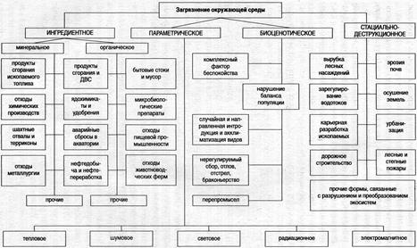 Источниками антропогенного загрязнения, наиболее опасного для популяций любых организмов, входящих в состав экосистем, являются промышленные предприятия (химические, металлургические, целлюлозно-бумажные, строительных материалов и др.)? теплоэнергетика, транспорт, сельскохозяйственное производство и другие технологии. Под влиянием урбанизации в наибольшей степени загрязнены территории крупных городов и промышленных агломераций. По видам загрязнений выделяют химическое, физическое и биологическое загрязнение (рис. 12.1 по Н. Ф. Реймерсу, 1990; с изменениями).